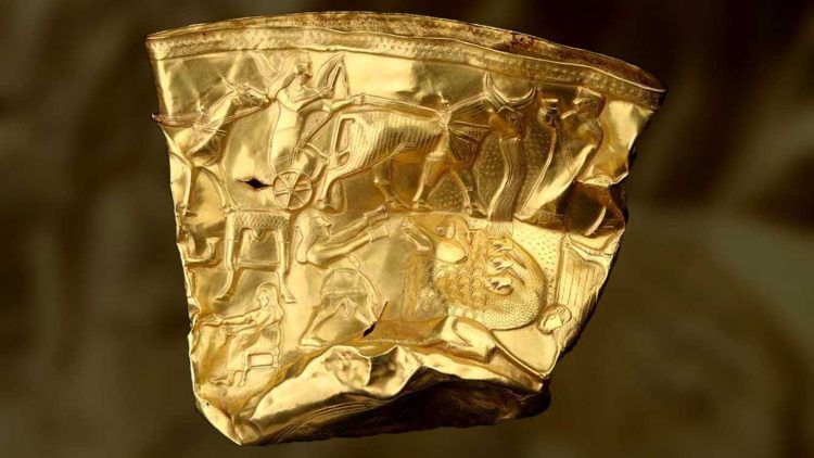 ⬅️ استخوان های انگشتان این مرد در اثر زنگار دکمه های مفرغی دستکش های آهنی وی سبز شده بودند. هنگامی که دايسون کاوش این قسمت را به عهده گرفت و با قلم مو شروع به تمیز کردن استخوان ها نمود، ناگهان یک سیم طلایی نمایان گردید. در آغاز حفار اندیشید که او یک النگو یافته است. اما طلا پایین تر و پایین تر رفت تا یک جام یکپارچه طلائی که هشت اینچ بلندی و هشت اینچ قطر داشت (حدود بیست سانتیمتر) نمایان شد.